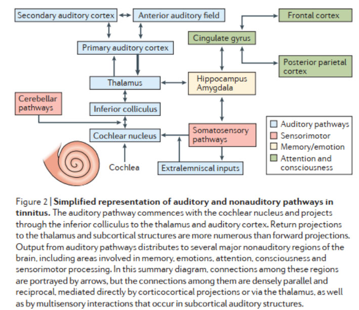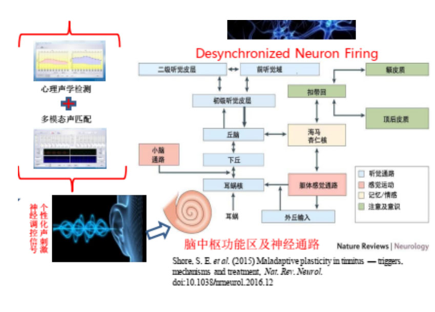 聲學信號通過耳蝸轉換成電信號,沿著聽神經通路,傳入丘腦、皮層及相關腦區,主動調節和疏通 聽神經通路,強化過慮雜亂信號功能; 激活眾多神經元,將因神經紊亂引起的自發放電和從附近捕捉的信號去同步化(步調不一致),打亂耳鳴信號產生和抑制放大。
