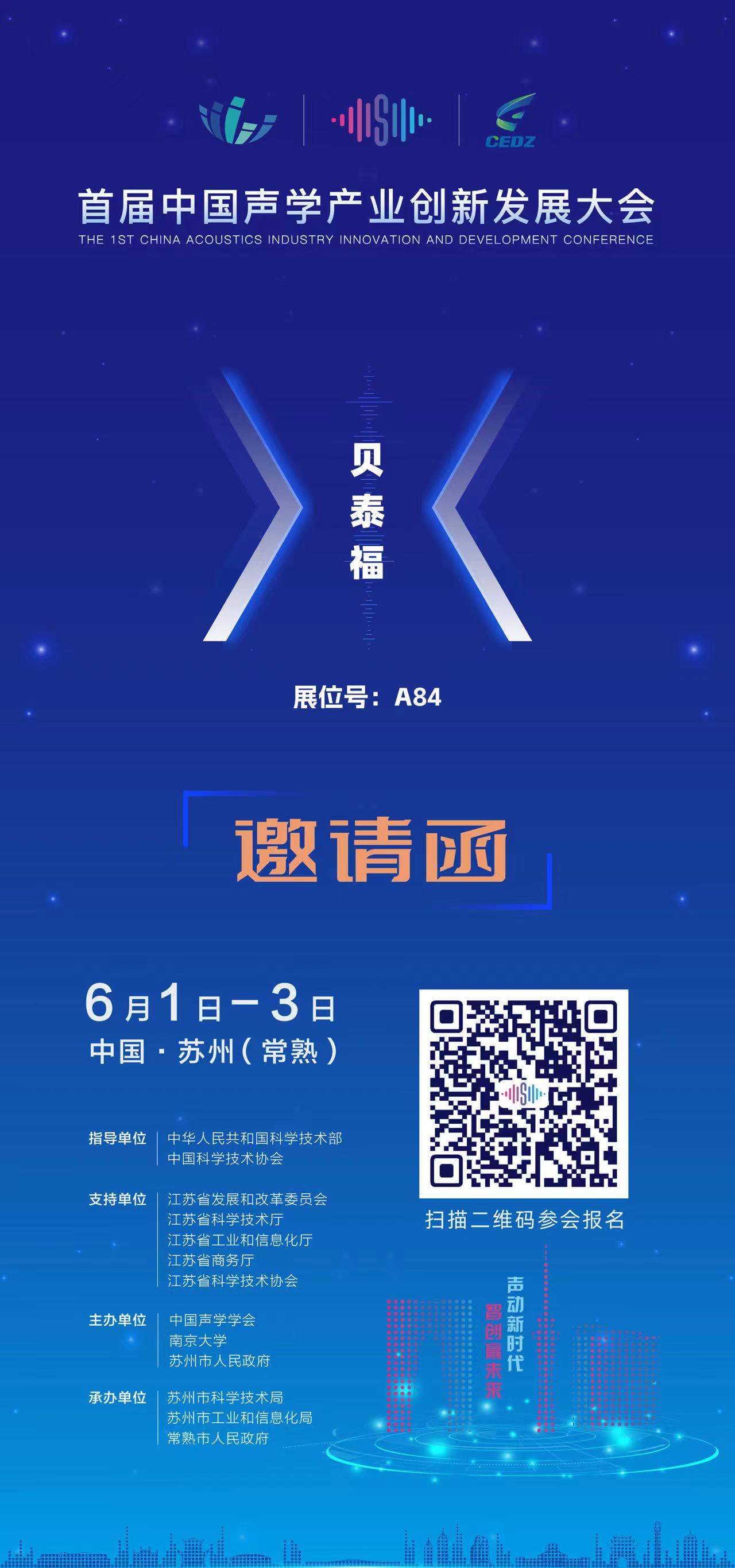 貝泰福受邀參加主題為“聲動新時代?智創贏未來” ,由中國聲學學會、南京大學、蘇州市人民政府共同舉辦的首屆中國聲學產業創新發展大會暨首屆中國(蘇州)聲學產業博覽會,將于2023年6月1日-6月3日在蘇州常熟國際展覽中心舉行。貝泰福位于A號館 A84展位。